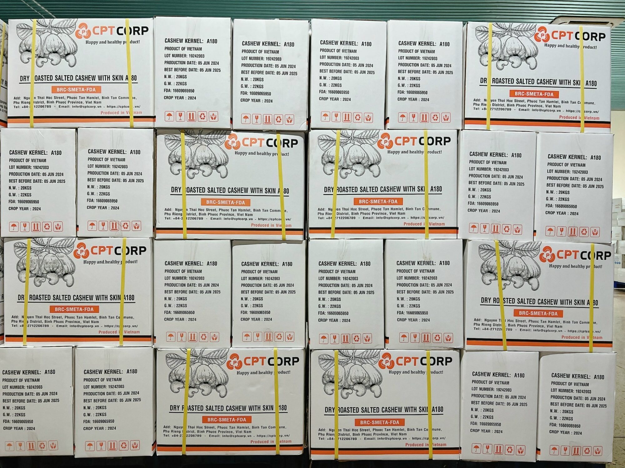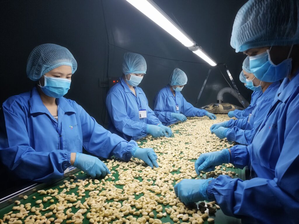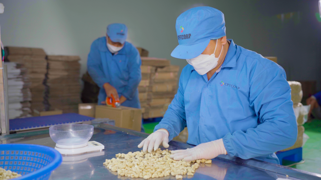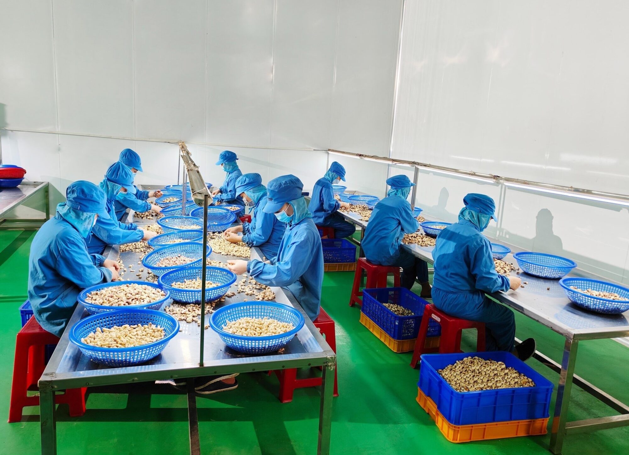 Grading + Steaming + Cooling -> Cutting -> Drying -> Humidifying -> Taking out the skin by machine > Color sorting cashew kernels -> Fumigation -> Packing process -> Storing and exporting
