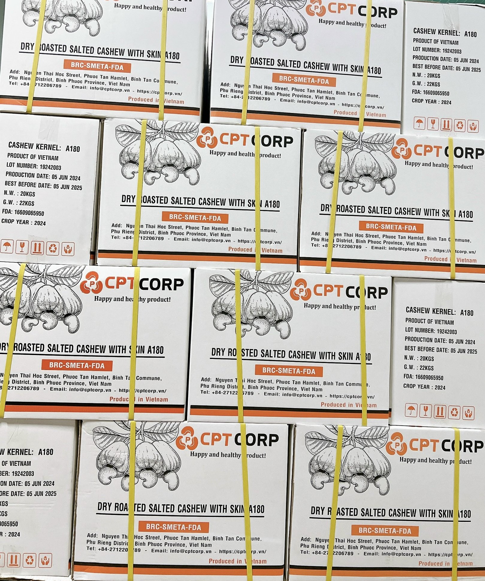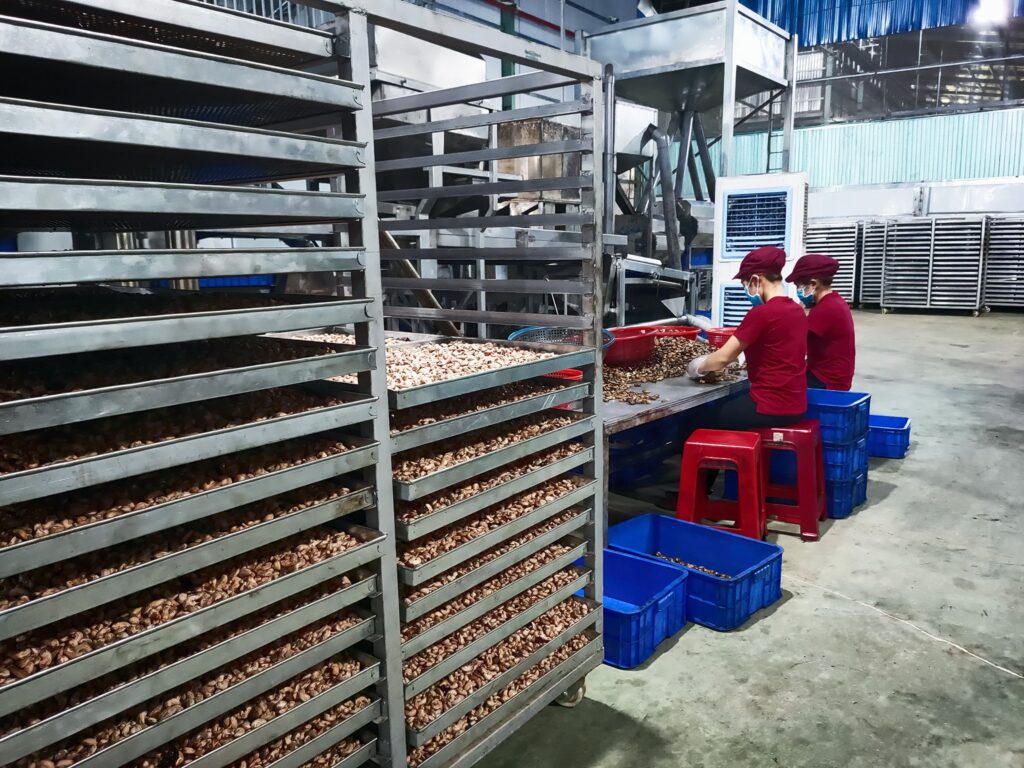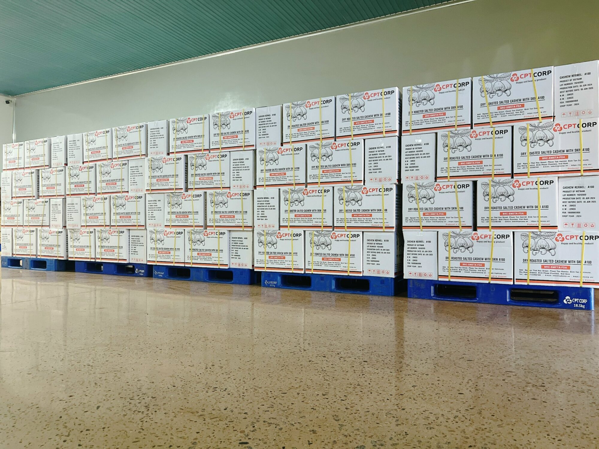 Grading + Steaming + Cooling -> Cutting -> Drying -> Humidifying -> Taking out the skin by machine > Color sorting cashew kernels -> Fumigation -> Packing process -> Storing and exporting